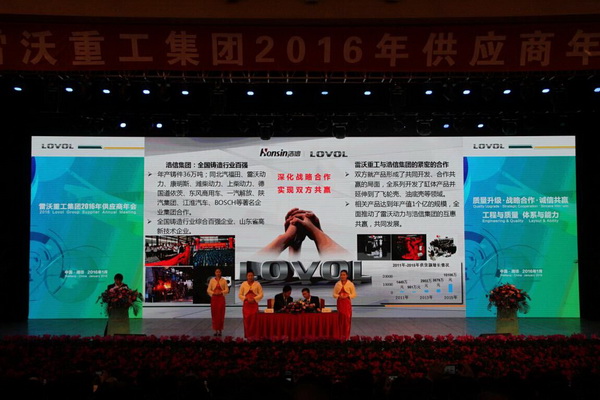 13-4,質(zhì)量升級(jí)?戰(zhàn)略合作?誠信共贏,工程與質(zhì)量,體系與能力為主題的雷沃重工集團(tuán)2016年供應(yīng)商年會(huì)在濰坊隆重召開,雷沃重工集團(tuán)董事長、總經(jīng)理王桂民,黨委書記梁啟榮,執(zhí)行總經(jīng)理王玉榮及公司經(jīng)營管理團(tuán)隊(duì)出席會(huì)議,來自全國的720多家供應(yīng)商1000多人參加會(huì)議,浩信集團(tuán)董事長呂繼賢及營銷公司總經(jīng)理金振偉應(yīng)邀參加本次年會(huì)。雷沃重工集團(tuán)是一家以大型產(chǎn)業(yè)裝備為主導(dǎo)業(yè)務(wù)、以工程機(jī)械、農(nóng)業(yè)裝備、車輛三大業(yè)務(wù)為主體的大型股份制企業(yè),2015年實(shí)現(xiàn)銷售收入215億元,品牌價(jià)值達(dá)到335.56億元,產(chǎn)品質(zhì)量及銷量連續(xù)多年居行業(yè)首位。
